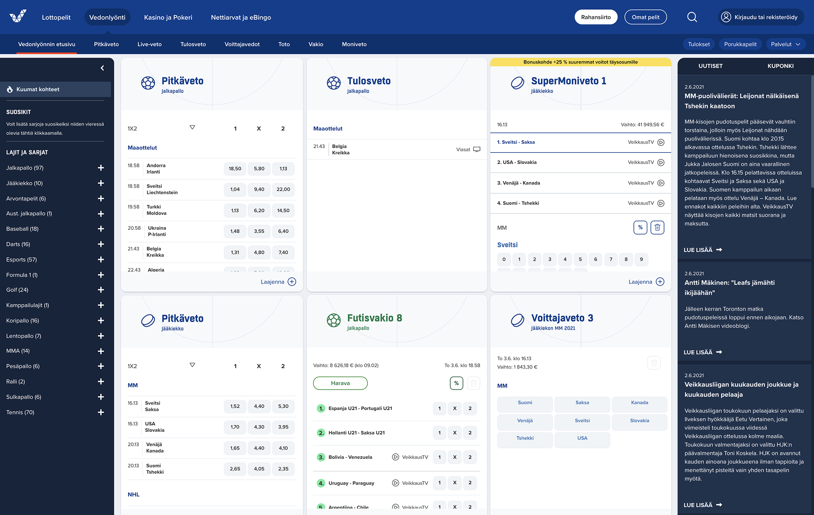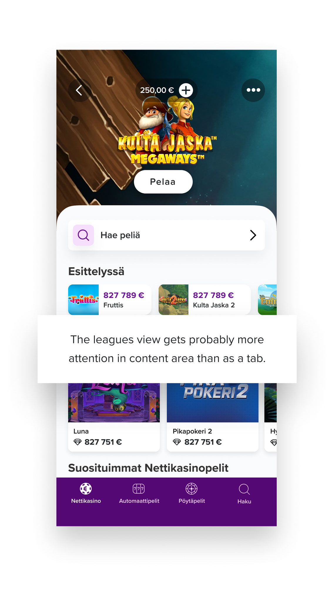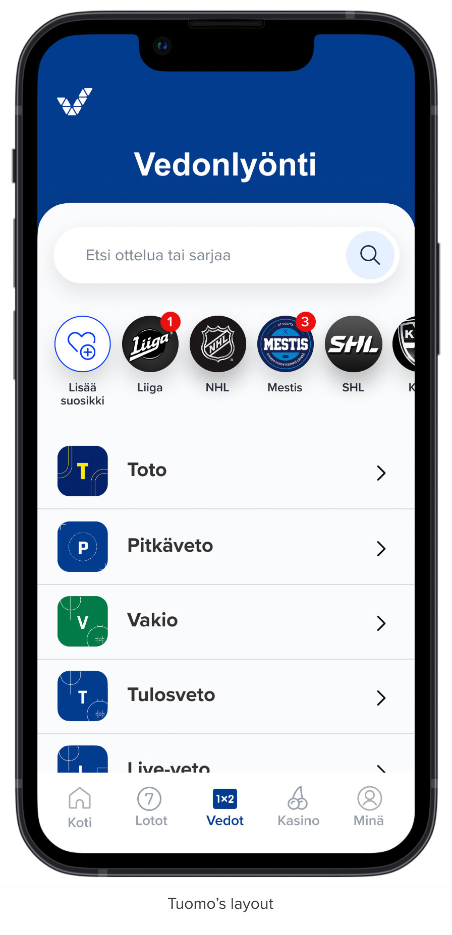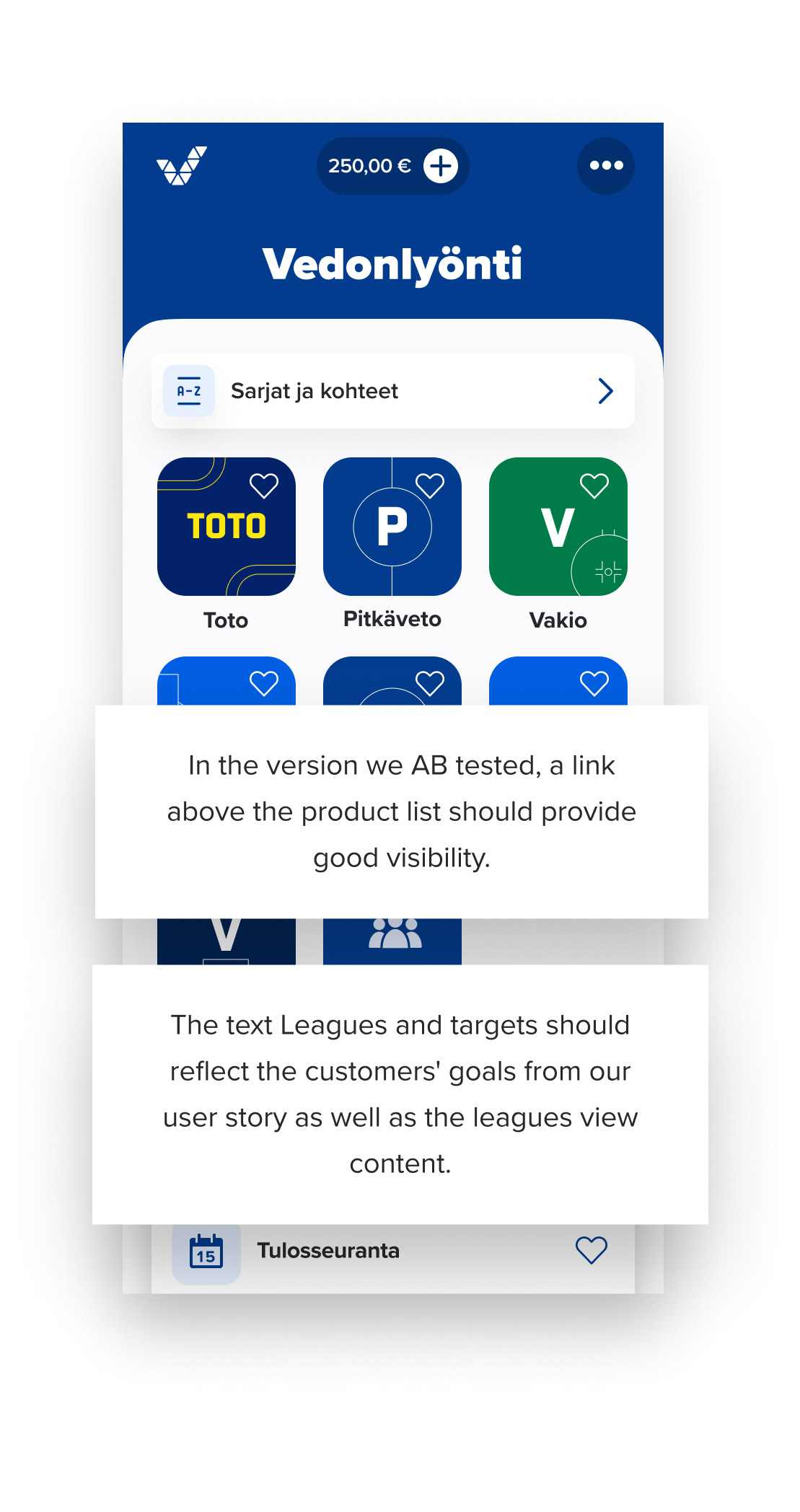 The leagues view fit our customers’ world well. Because customers chose betting targets by sport league, test participants liked the leagues view concept, and found it intuitive.