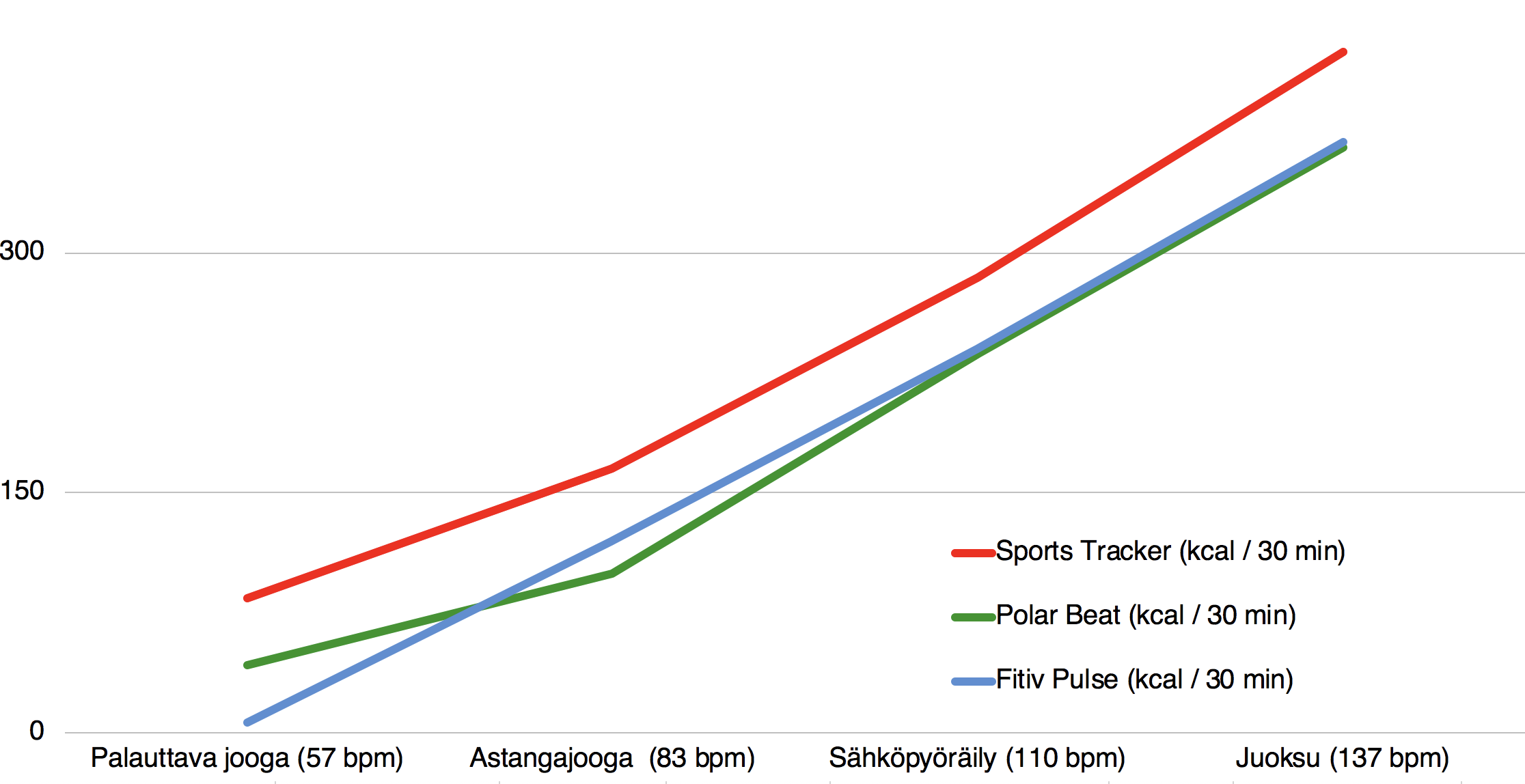 Vertasin oman syke-kalorilaskurini lukuja joogaa tutkineen väitöskirjan tuloksiin. Syke-kalorilaskuri laskee kävelyn kulutuksen melko johdonmukaisesti ja ennakoitavasti, vaikka sen antamat luvut poikkeavatkin väitöskirjan mitatuista luvuista (kuva alla). Väitöskirjan luvut on saatu happinaamarin avulla. Eroja pitäisikin syntyä, koska happinaamari mittaa hapen kokonaiskulutuksen, ja laskuri arvioi aktiivista kulutusta.