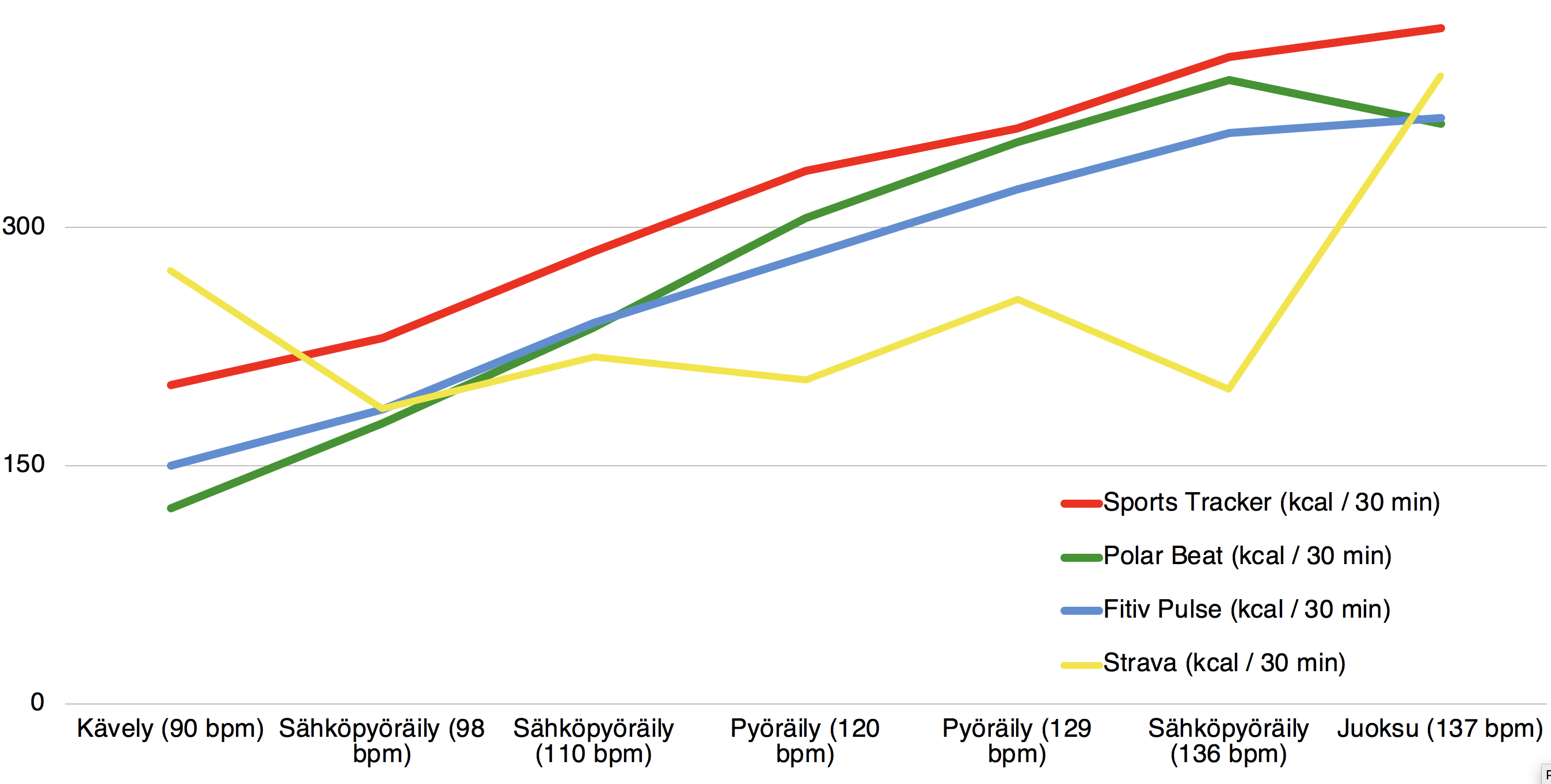 Lumessa ja kiireessä hiipuvalla akulla sähköpyöräily (136 bpm) kulutti Stravan mukaan vain 10 % enemmän energiaa kuin sähköpyöräily helpoissa oloissa (98 bpm). Muissa sovelluksissa tämä ero on noin 100 %. Toisin kuin Stravassa, niissä energian kulutus myös kasvaa aika tasaisesti, kun syke nousee.