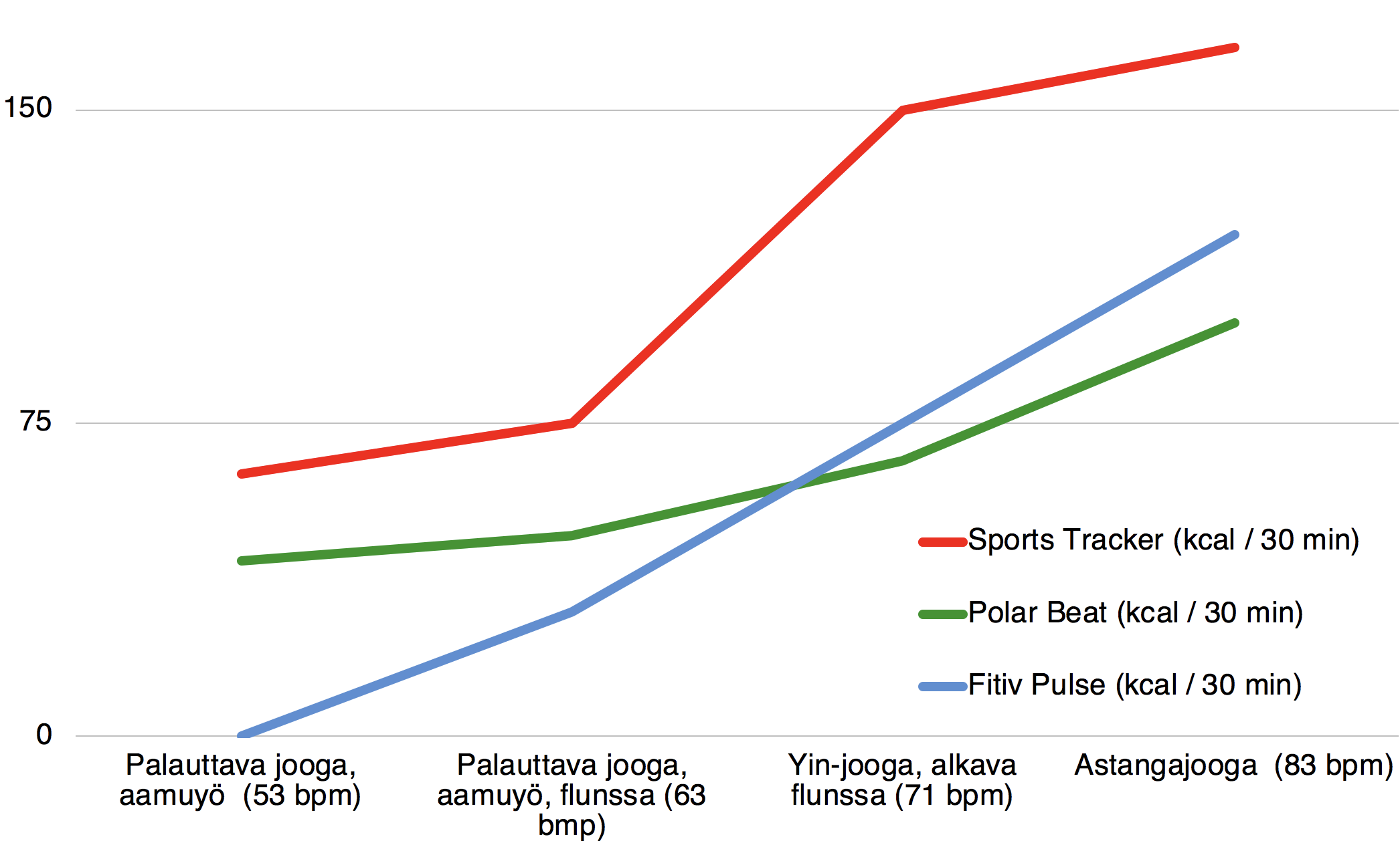 Polar Beat -sovelluksessa eri joogamuotojen kulutukset vaihtelivat yllättävän vähän. Kun syke oli 45–50 % maksimisykkeestä (n. 83 bpm), kulutuksessa oli kuoppa.