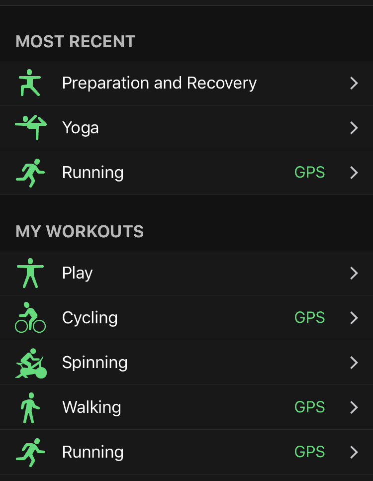 Myös Sports Tracker näyttää viimeisimmät lajit listan alussa. Se näyttää kolme lajia. Kolme viimeisintä riitti käytännössä, vaikka merkkasinkin useampaa lajia.