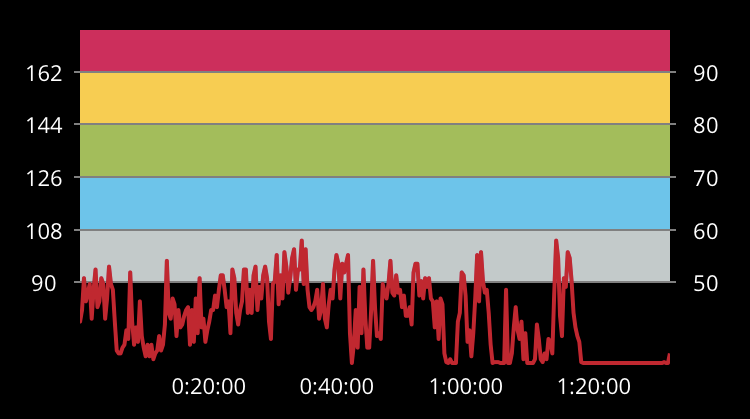 Kun Polar Beatin sykekäyrää (kuva alla) nostaisi kaksi sykealuetta ylemmäs, se vastaisi paremmin omaa kokemustani astangajoogasta. Tällöin kaksi kolmasosaa olisi kevyttä, kolmasosa kohtalaista ja 0.5 % raskasta liikuntaa. Tämä kuulostaisi jo aktiiviselta joogalta.