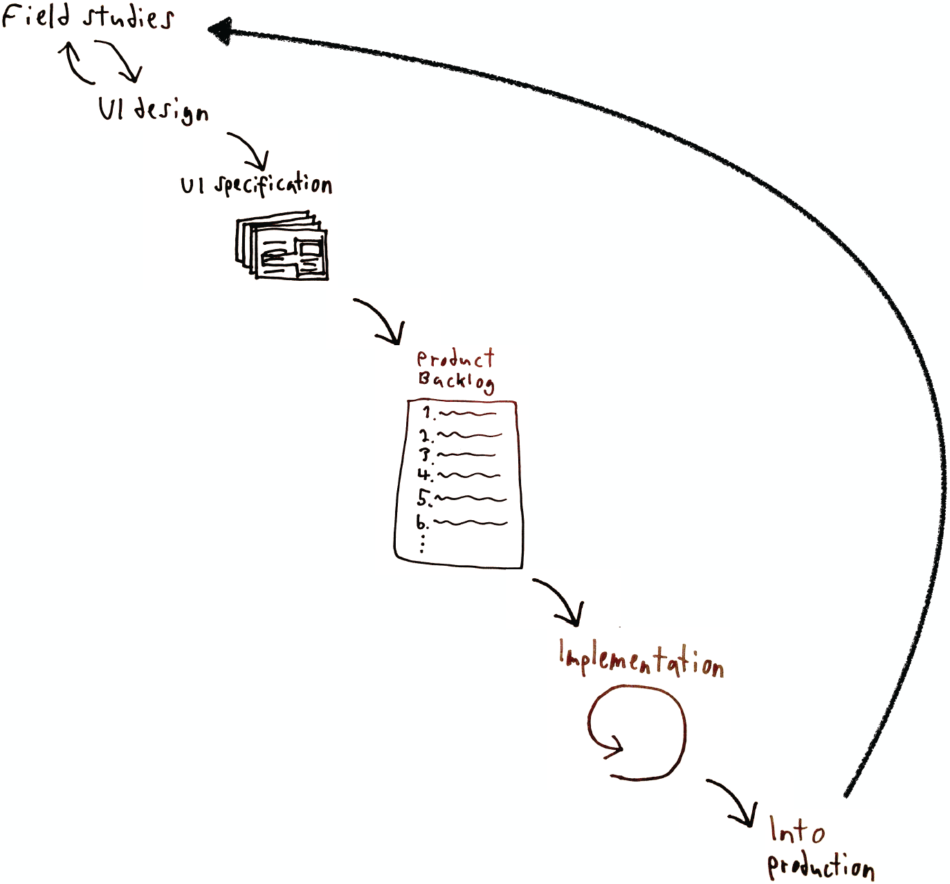 Kokonaisuuksien priorisointi oli kiinnostavassa asemassa, kun palvelu oli siirtynyt tuotantoon esimerkkiprojektissa, jota entinen opettajani esitteli NordiCHI’14-koulutustyöpajassa. Koska käyttäjien ja asiakkaiden toimintaympäristö muuttuu uuden palvelun käyttöönoton myötä, myös heidän toiminnalliset, palveluun kohdistuvat tarpeensa muuttuvat. Nämä tarpeiden muutokset kyetään huomioimaan syklisessä palvelukehityksessä (kuva yllä). Kun esimerkkipalvelu oli viety tuotantoon, nostettiin ohi muun prioriteettijonon kolme kokonaisuutta, jotka edistivät organisaatiotavoitteen “uuden ohjelmiston laajamittainen käyttöönotto” toteutumista. Kenttätutkimuksissa oli seurattu käyttöönoton etenemistä ja haastateltu tahoja, jotka eivät olleet vielä ottaneet palvelua käyttöönsä. Kun tämän organisaatiotavoitteen kannalta tärkeät kokonaisuudet oli saatu tehtyä, tehtiin kokonaisuuksia, jotka edistivät käyttäjien tavoitteiden saavuttamista.