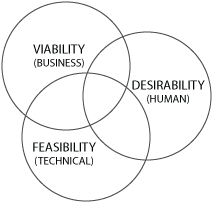 Toimintamalli “asiakas kertoo organisaation tavoitteet” yhdistää tehokkaasti elinkelpoisuuden (engl. viability), haluttavuuden (engl. desirability) ja toteutettavuuden (engl. feasibility) näkökulmat, ja helpottaisi ihmiskeskeisen suunnittelun arkea omassa ympäristössäni. Asiakkaan edustaja ilmaisee organisaatiotavoitteet vapaamuotoisesti. Kun asiakas ehdottaa ratkaisumallia, ei kuitenkaan keskitytä hänen sanoihinsa, vaan pyritään kuuntelemaan toiminnallisia tarpeita, joita ehdotettu ratkaisu voisi palvella, “sanojen takana”. Tässä kohtaa ihmiskeskeisen suunnittelun, palveluajattelun ja käyttäjätutkimuksen lähestymistavat soveltuvat mielestäni paitsi käyttäjien myös asiakkaiden ymmärtämiseen. Kun eri puolilla ehdotetut, samaa tai samankaltaista tarvetta palvelevat ratkaisumallit saadaan redusoitua yhdeksi toiminnalliseksi kokonaisuudeksi, helpottuu paitsi ihmiskeskeinen suunnittelu, myös ohjelmistokehitys. Tarvittavat kokonaisuudet saadaan toteutettua vähemmillä resursseilla, mutta valmiit toteutukset ovat silti asiakkaille elinkelpoisia ja käyttäjille haluttavia.